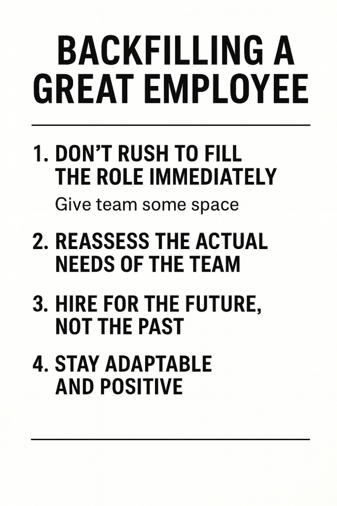 You can’t replace that person but you can replace their function. Look at the skills and balance of the team. What did they bring that’s now missing? Sometimes the gap isn’t in hard skills, it’s energy, communication, or organization. Identify that first.