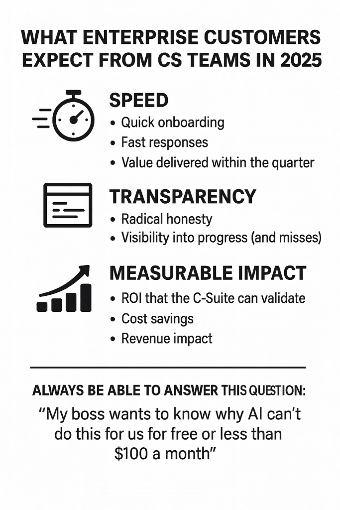 CFOs and budget owners want visibility into the entire value equation: licenses, integrations, downtime, and outcomes. Transparency builds trust — but it also answers the question: “Why shouldn’t we just replace this with AI?” CS must show the hidden costs, risks, and trade-offs that AI-only solutions ignore.