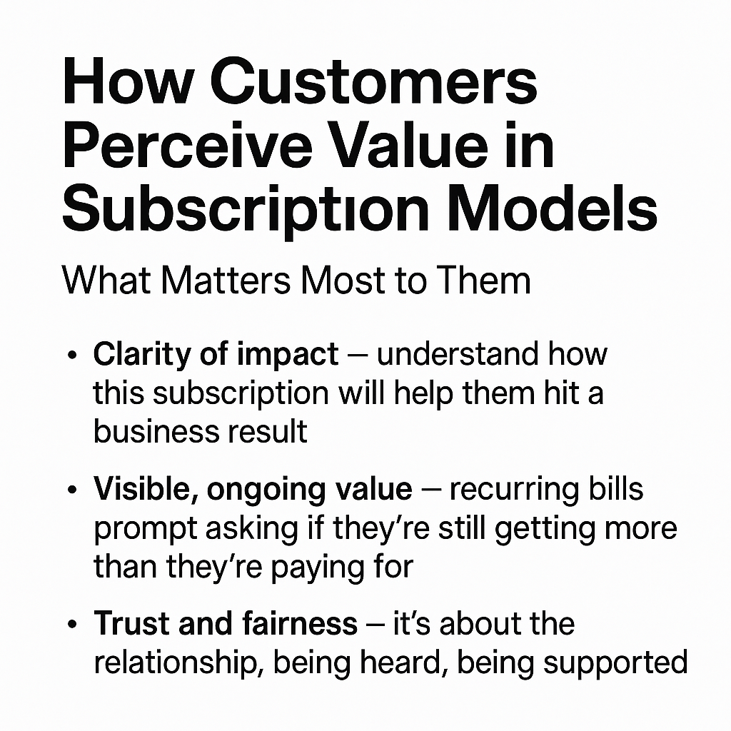 Value perception isn’t purely logical. In subscription models the relationship is ongoing, so behavioral and emotional factors matter. Fair pricing, transparency, responsiveness, and being seen as a partner, not just a vendor, builds trust.