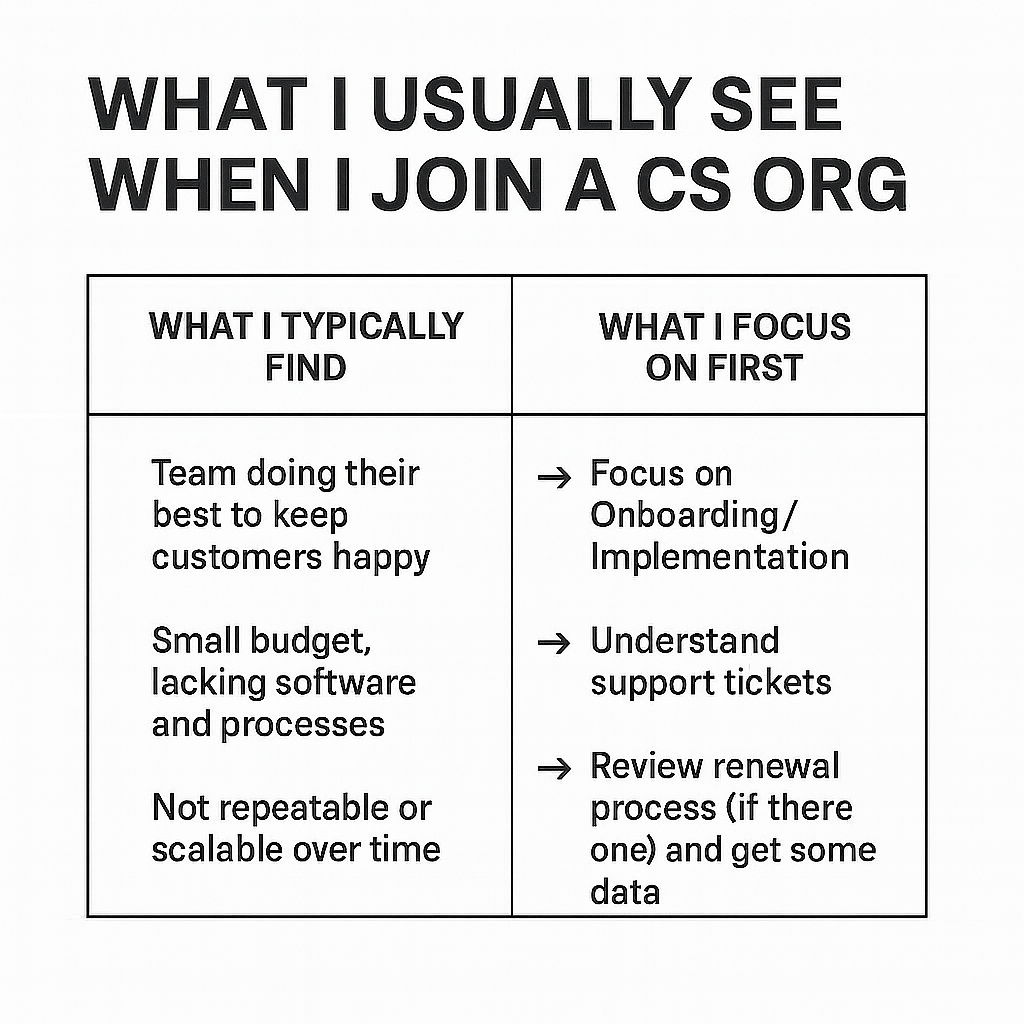 From there, we can start designing a system that works with the team, not against them. Start with onboarding/implementation, review the support tickets, understand if there is a renewal process.